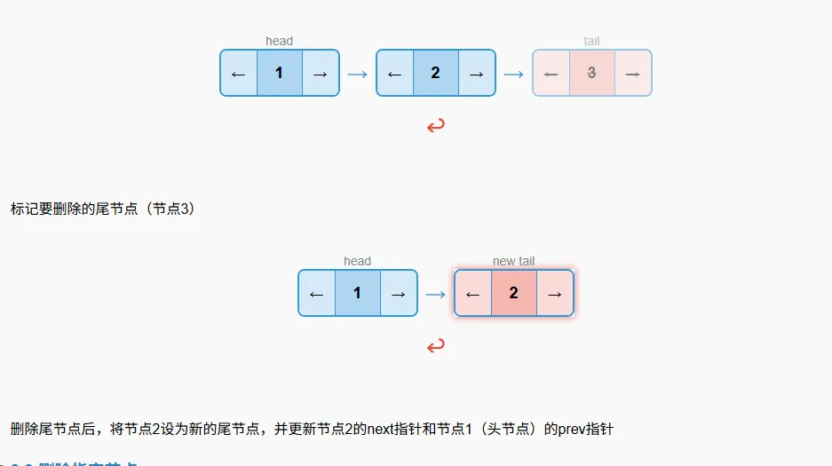 public boolean deleteTail() {if (head == null) {return false;}// 单节点链表 → 调用专用删除方法if (head.next == head) {return deleteOnlyNode();}DoublyNode oldTail = head.prev; // 原尾节点DoublyNode newTail = oldTail.prev; // 新尾节点(原尾节点的前驱)// 1. 新尾节点与头节点建立双向连接(跳过原尾节点)newTail.next = head;head.prev = newTail;return true;