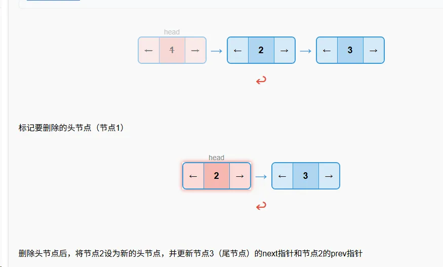 public boolean deleteHead() {if (head == null) {return false;}// 单节点链表 → 调用专用删除方法if (head.next == head) {return deleteOnlyNode();}DoublyNode oldHead = head;DoublyNode tail = oldHead.prev; // 尾节点DoublyNode newHead = oldHead.next; // 新头节点(原头节点的后继)// 1. 尾节点与新头节点建立双向连接(跳过原头节点)tail.next = newHead;newHead.prev = tail;// 2. 更新头节点为新头节点head = newHead;return true;