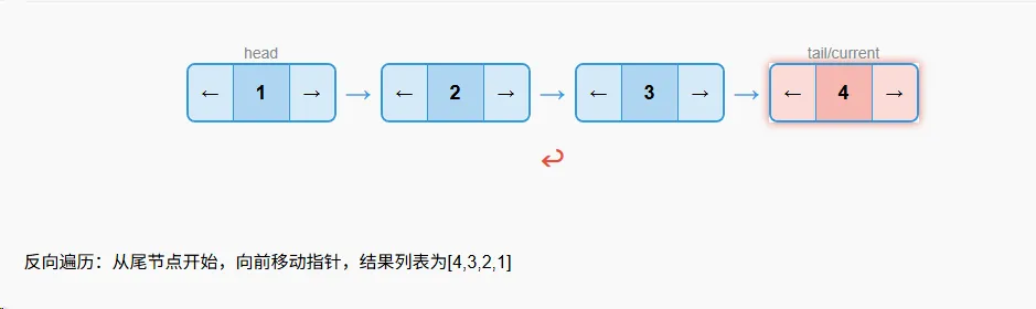 public List<Double> reverseTraverse() {List<Double> result = new ArrayList<>();if (head == null) {return result;}// 尾节点 = 头节点的prev,从尾节点开始遍历DoublyNode current = head.prev;result.add(current.data);current = current.prev;// 指针回到尾节点时停止while (current != head.prev) {result.add(current.data);current = current.prev;}return result;