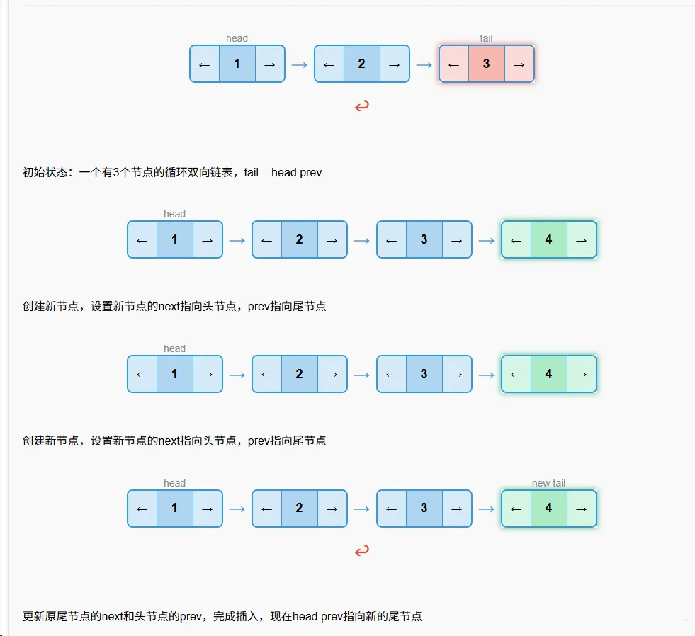 public boolean prepend(double data) {// 复用append逻辑:先插入到尾部,再将头节点指向新节点(原尾部)append(data);head = head.prev; // 新节点是原尾部,head.prev指向它return true;