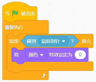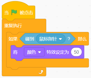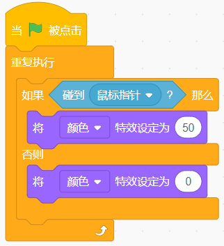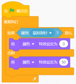 苹果颜色特效设为50为绿色,颜色特效设为0为红色,下列哪个选项的程序能让苹果在碰到鼠标时变为绿色,否则恢复默认红色?( )