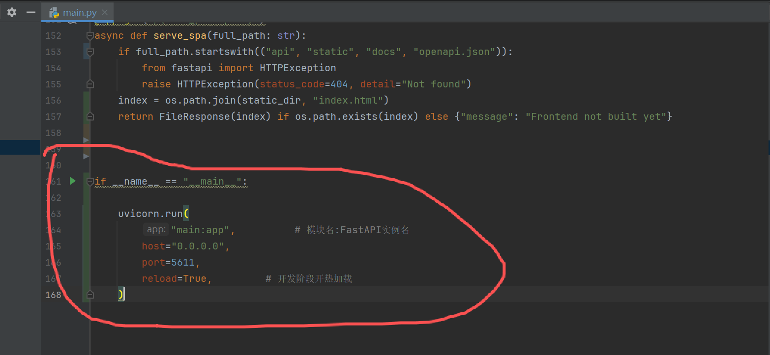 if __name__ == "__main__":uvicorn.run("main:app", # 模块名:FastAPI实例名host="0.0.0.0",port=5611,reload=True, # 开发阶段开热加载)