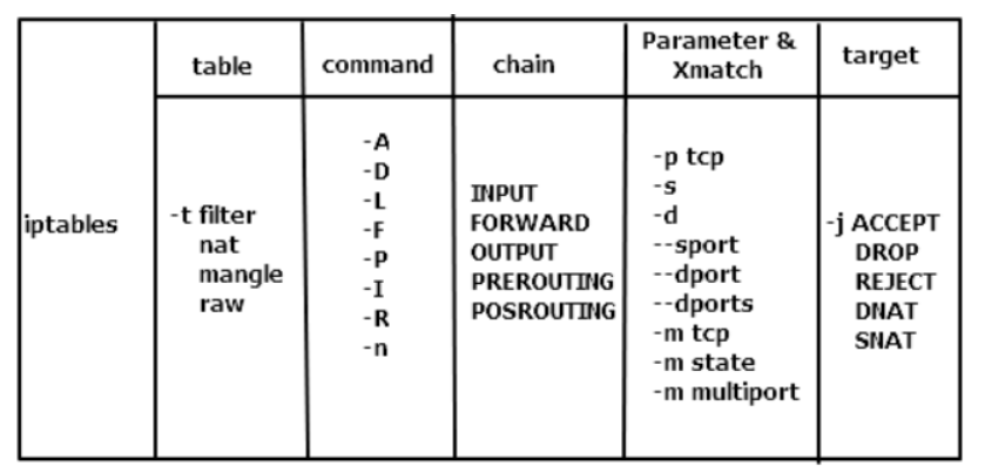 | -t | 后接表名,指定对哪张表进行操作。如果不加-t指定表,则默认为filter表 |