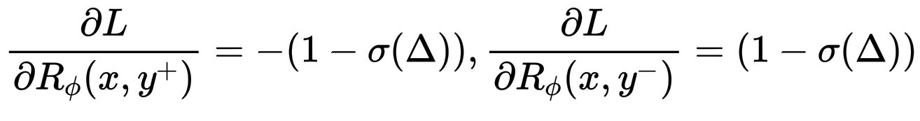 现在,它的美妙之处就在这里。当你对 R_\phi(x, y^+) 和 R_\phi(x, y^-) 求损失函数的导数时,你会得到一个简单的公式,其中 \Delta = R_\phi(x, y^+) - R_\phi(x, y^-)。