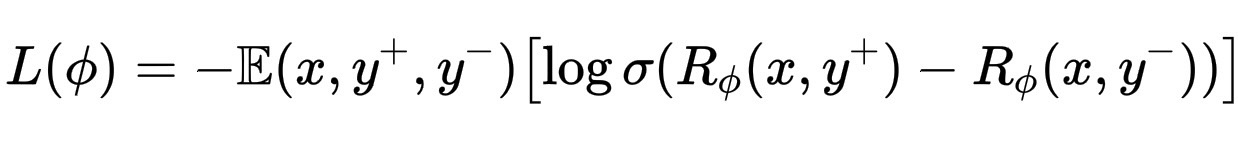L(\phi) = -\mathbb{E}{(x, y^+, y^-)} \left[ \log \sigma(R_\phi(x, y^+) - R_\phi(x, y^-)) \right]