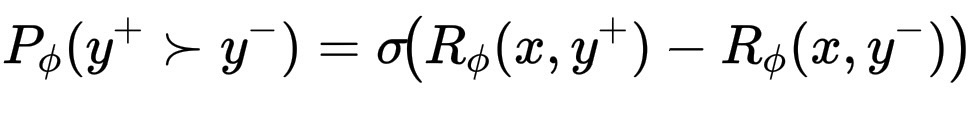 P_\phi(y^+ \succ y^-) = \sigma\!\left(R_\phi(x, y^+) - R_\phi(x, y^-)\right)