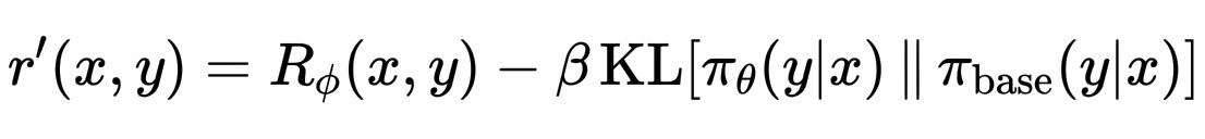 r’(x, y) = R_\phi(x, y) - \beta \, \mathrm{KL}[\pi_\theta(y|x) \,\|\, \pi_{\text{base}}(y|x)]