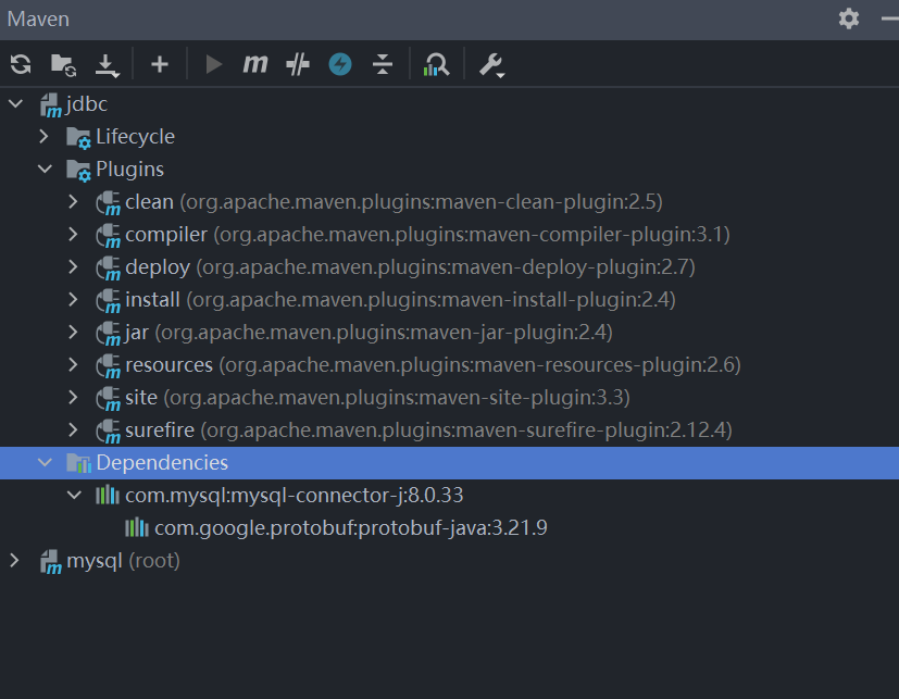 <!-- JDBC 的依赖 --><dependency><groupId>mysql</groupId><artifactId>mysql-connector-java</artifactId><version>8.0.33</version></dependency>