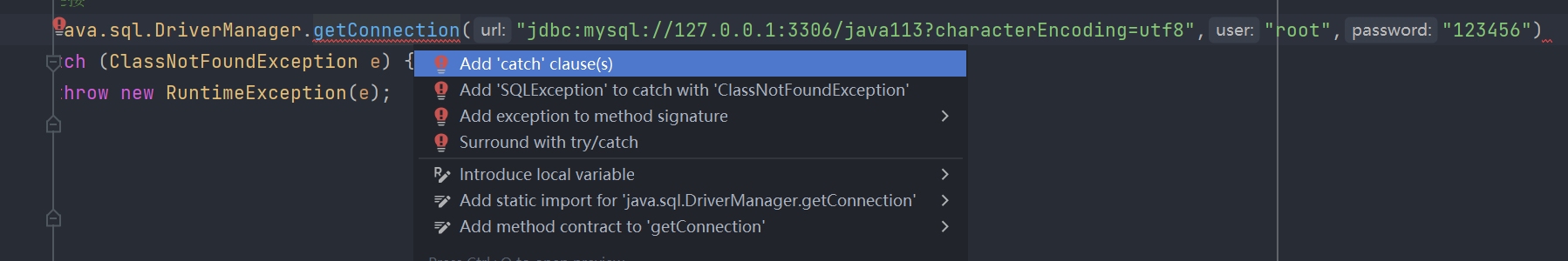 // 设置数据库连接串mysqlDataSource.setURL("jdbc:mysql://127.0.0.1:3306/jdbc?characterEncoding=utf8&allowPublicKeyRetrieval" +"=true&useSSL=false");// 用户名mysqlDataSource.setUser("root");// 密码mysqlDataSource.setPassword("123456");// 定义JDBC的数据源对象DataSource dataSource = mysqlDataSource;