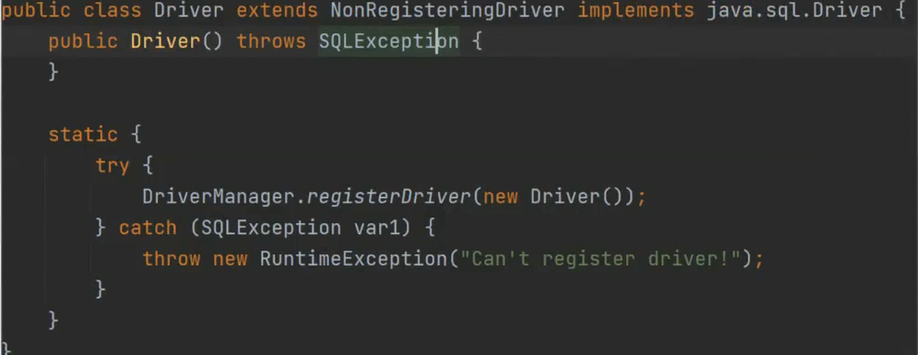 1.注册数据库厂家提供的驱动,通过完全限定名加载指定的类到JVM下,如下