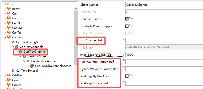 Icu Channel Ref: CanTrcv模块中的这个参考一般不会用到。但是关于Icu的Ref参数很多模块都会有(CanTrcv, Lin, Can .e.g.)详细的ICU唤醒可以参考《【MCAL】AUTOSAR架构下ICU唤醒详解》一文。