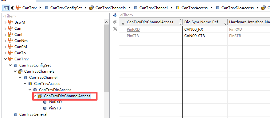 引用我们在DIO模块里面配置的CanTrcv的STB和Rx的Dio Channel就行。CanTrcv模块会使用Dio_ReadChannel和Dio_WriteChannel来读写Cantrcv的Rx/STB硬件。