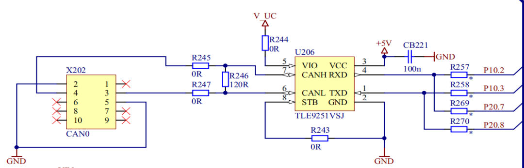 TXD和RXD和MCU的TXD(Pin20.8)RXD(Pin20.7)直连,CANH和CANL和CAN总线直连。