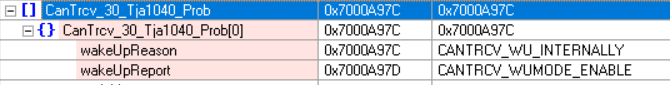 {/* ---- Common attributes ---- *//* ! Last detected wakeup reason */CanTrcv_30_Tja1040_TrcvWakeupReasonType wakeUpReason;/* ! Specifies whether or not to report wakeups */CanTrcv_30_Tja1040_TrcvWakeupModeType wakeUpReport;/* ! HW specific attributes */} CanTrcv_30_Tja1040_Prob_Type;