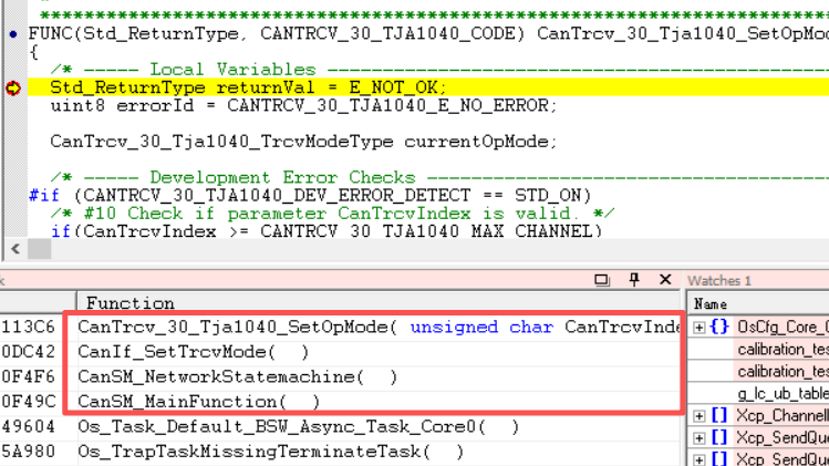 奇怪的是CanTrcv_30_Tja1040_Prob_Type中并没有变量可以观测CanTrcv的逻辑状态。有问题的时候需要我们Debug代码去分析当前CanTrcv软件处于什么逻辑状态。