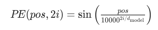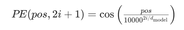 pos:序列中元素的位置索引(例如句子中第 1 个词pos=0,第 2 个词pos=1,以此类推);i:位置编码的维度索引(例如d_model=512时,i的范围是 0~511);d_model:模型的特征维度(即每个元素的嵌入向量维度,例如 512);10000:一个固定的缩放因子,用于控制正弦 / 余弦函数的周期(周期随维度i增大而变长)。