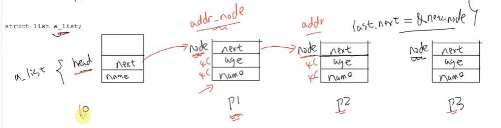 struct person{char *name;int age;struct person *next;/*指向下一个人*/
