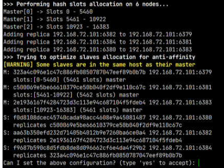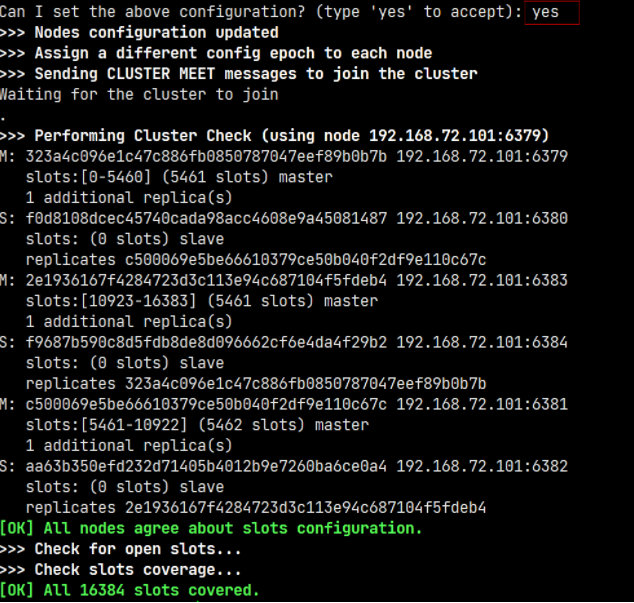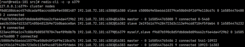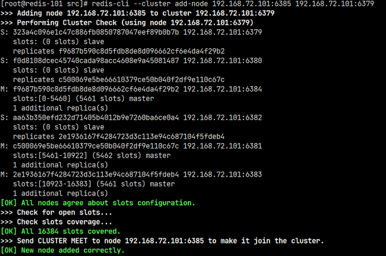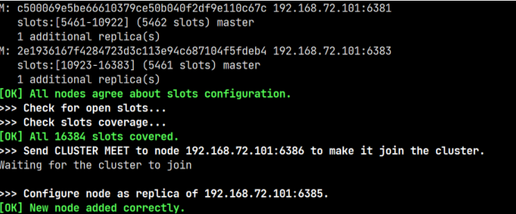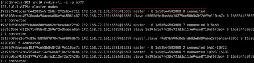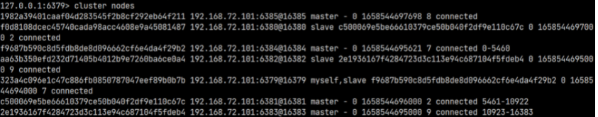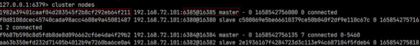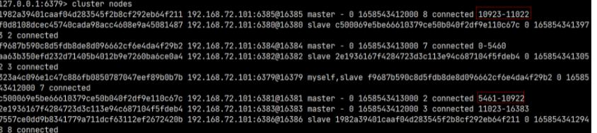 执行上面的命令后,就会从指定的 6385 节点上分配 100 个槽给 6386 节点。查看节点信息可以发现已经分配成功: