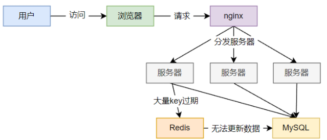 key 中对应数据存在,在某一时刻,缓存中大量 key 过期,而此时大量高并发请求访问,会直接访问后端数据库,导致数据库崩溃。