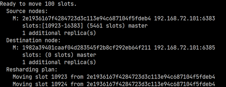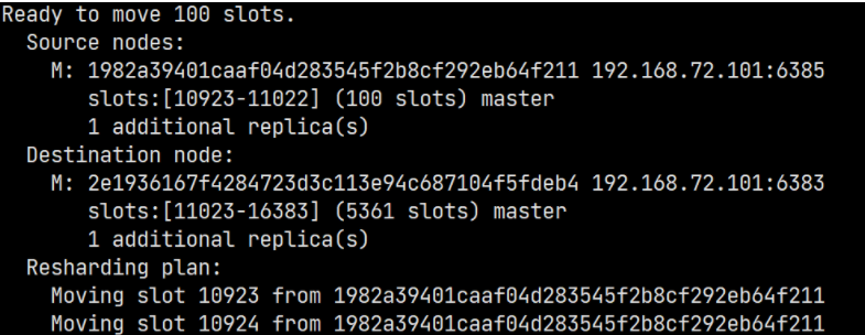 由于集群中增加了新节点,需要对现有数据重新进行分片操作。重新分片的语法如下: