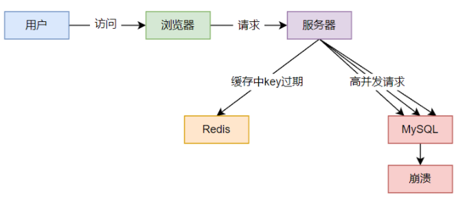 当某个 key 对应的数据实际存在,但该 key 在 Redis 缓存中过期时,若此时有大量请求访问该数据,由于缓存已过期,这些请求会直接访问数据库,并将数据回设到缓存中。高并发下直接访问数据库,会导致数据库崩溃。