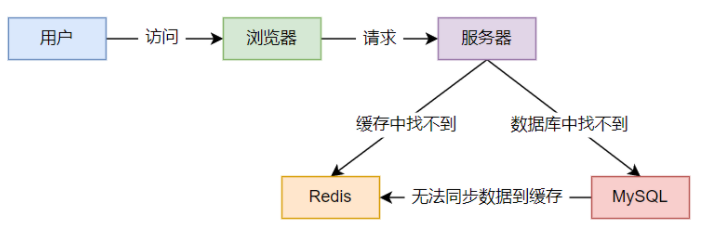 用户查询数据时,Redis 缓存未命中,直接访问数据库;若请求量过大(如恶意攻击的非正常 URL 访问),会超出数据库承载能力,导致数据库崩溃。