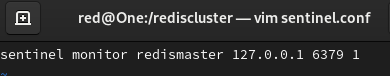 最后新增一个窗口,在 /rediscluster 目录下新建 sentinel.conf 文件,文件名称不能写错,必须叫这个名称。文件内容如下: