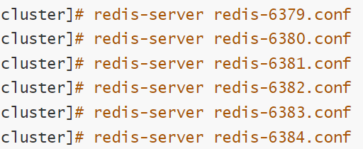复制 redis.conf 文件到 /cluster 目录中,然后在该目录下分别创建 6 个配置文件: redis-6379.conf、redis-6380.conf、redis-6381.conf、redis-6382.conf、redis-6383.conf、redis-6384.conf 并写入文件内容。