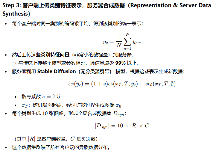 这些表示与**无分类器扩散模型(classifier-free diffusion model)**结合,用于服务器端生成辅助数据。