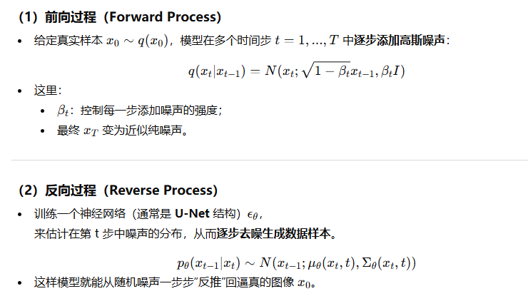 扩散模型(Diffusion Models, DMs),尤其是 去噪扩散概率模型(DDPM, Denoising Diffusion Probabilistic Models),是一类生成模型。