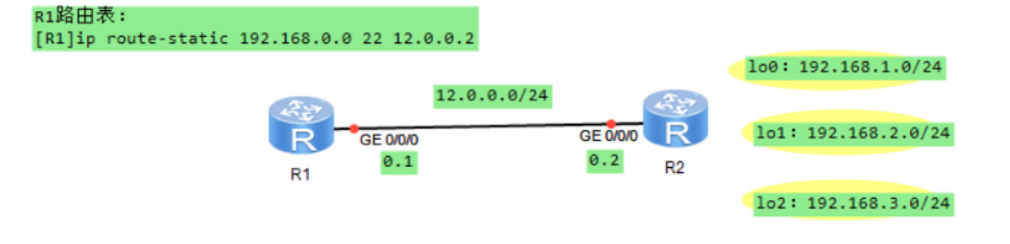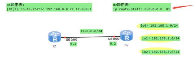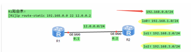 代码:[R2]ip route-static 192.168.0.0(汇总网段) 22(汇总网段掩码) NULL 0