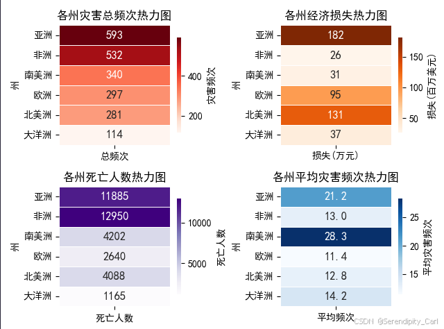 画出各州灾害总频次热力图 经济损失热力图 死亡人数热力图 平均灾害频次热力图