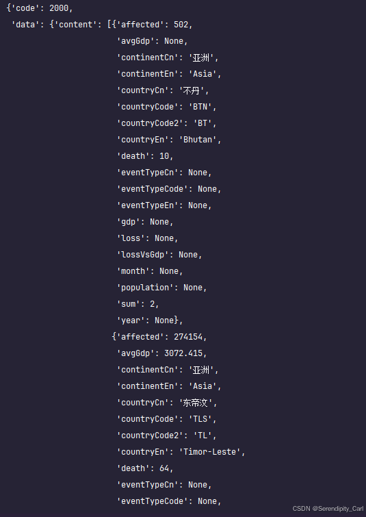 for li in json_data:country = li['countryCn']state = li['continentCn']total = li['sum']death_people = li['death']influence_people = li['population']found_lose = li['loss']# 可以输出打印 对比数据是否符合