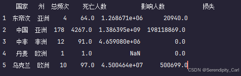 for li in json_data:country = li['countryCn']state = li['continentCn']total = li['sum']death_people = li['death']influence_people = li['population']found_lose = li['loss']dit = {'国家': country,'州': state,'总频次': total,'死亡人数': death_people,'影响人数': influence_people,'损失': found_lose}lis.append(dit)pd.DataFrame(lis).to_excel('global_disaster.xlsx',index=False)