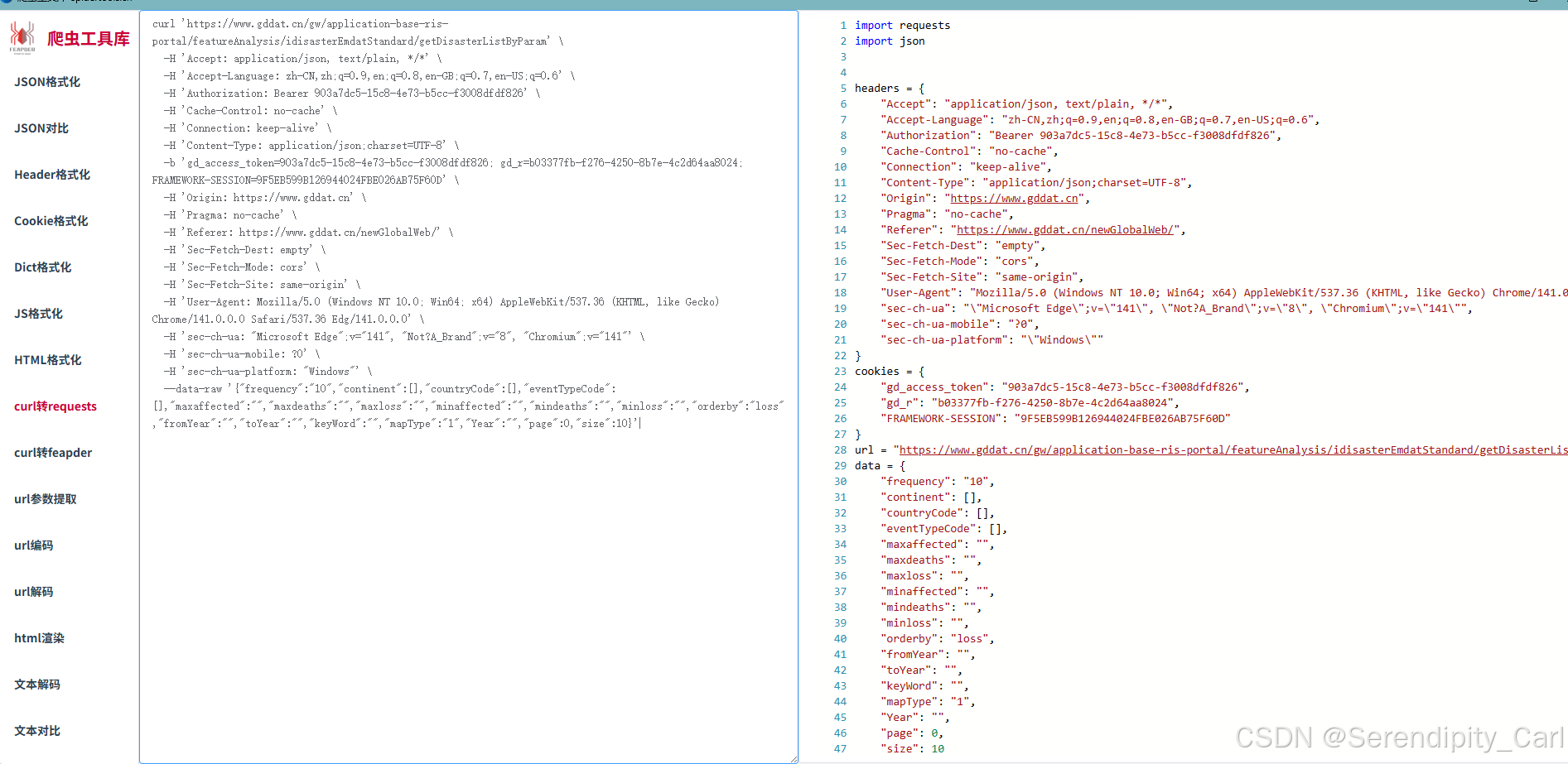 import jsonheaders = {"Accept": "application/json, text/plain, */*","Accept-Language": "zh-CN,zh;q=0.9,en;q=0.8,en-GB;q=0.7,en-US;q=0.6","Authorization": "Bearer b81b81e2-da54-4548-ac4f-4504ba437b51","Cache-Control": "no-cache","Connection": "keep-alive","Content-Type": "application/json;charset=UTF-8","Origin": "https://www.gddat.cn","Pragma": "no-cache","Referer": "https://www.gddat.cn/newGlobalWeb/","Sec-Fetch-Dest": "empty","Sec-Fetch-Mode": "cors","Sec-Fetch-Site": "same-origin","User-Agent": "Mozilla/5.0 (Windows NT 10.0; Win64; x64) AppleWebKit/537.36 (KHTML, like Gecko) Chrome/141.0.0.0 Safari/537.36 Edg/141.0.0.0","sec-ch-ua": "\"Microsoft Edge\";v=\"141\", \"Not?A_Brand\";v=\"8\", \"Chromium\";v=\"141\"","sec-ch-ua-mobile": "?0","sec-ch-ua-platform": "\"Windows\""