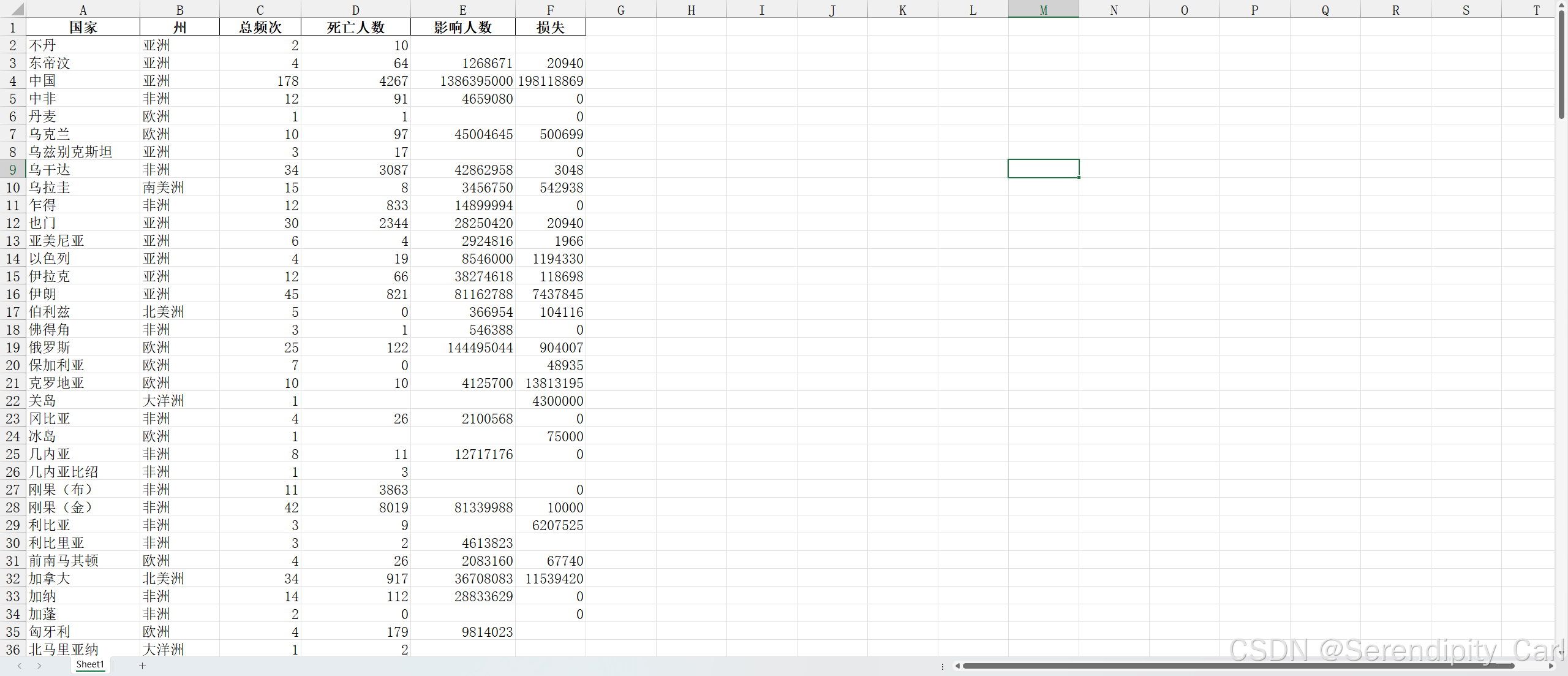 df = pd.read_excel('global_disaster.xlsx')# 将损失为缺失值的国家名字 展示出来