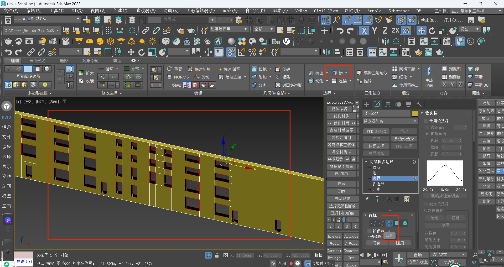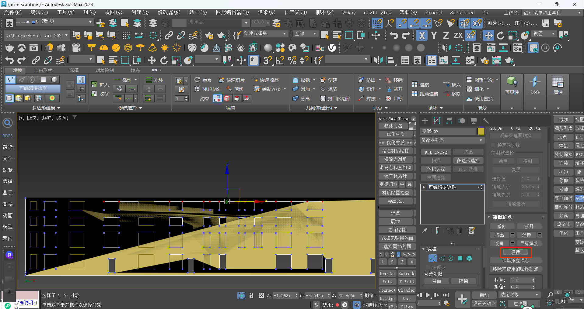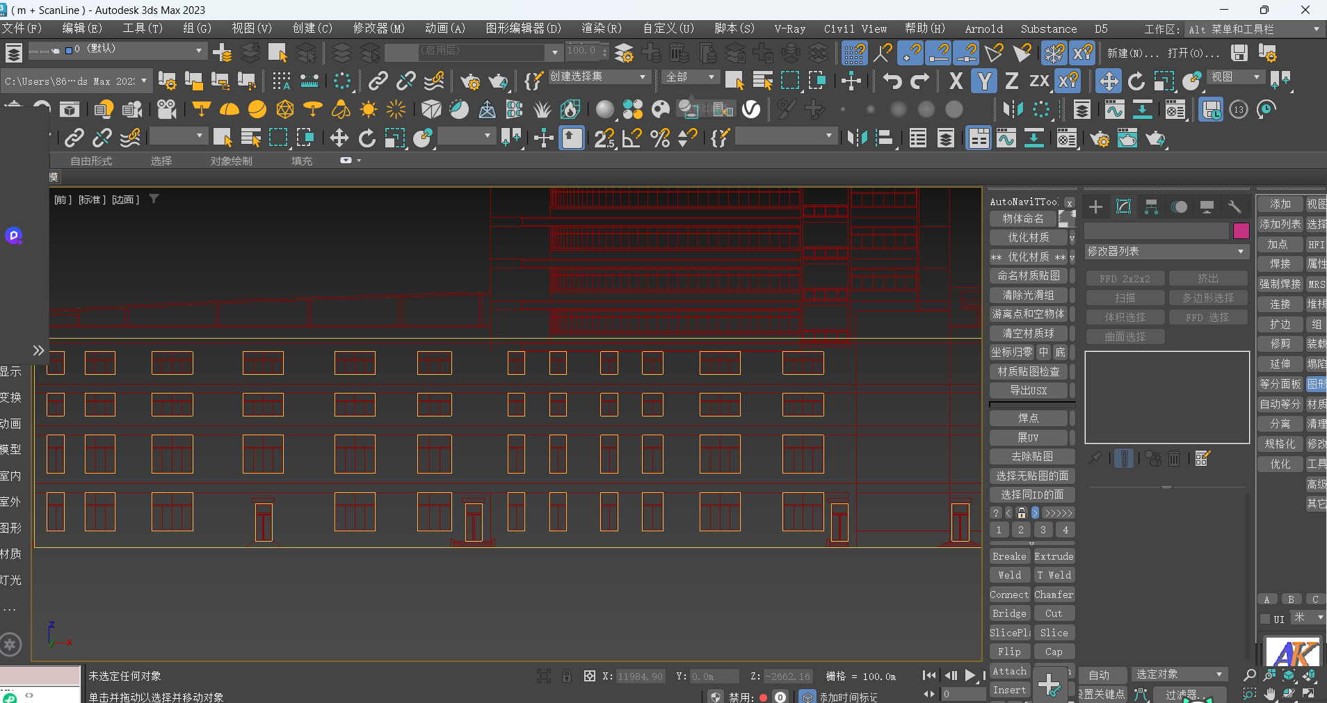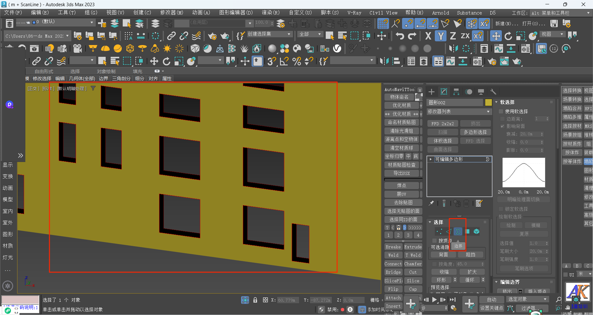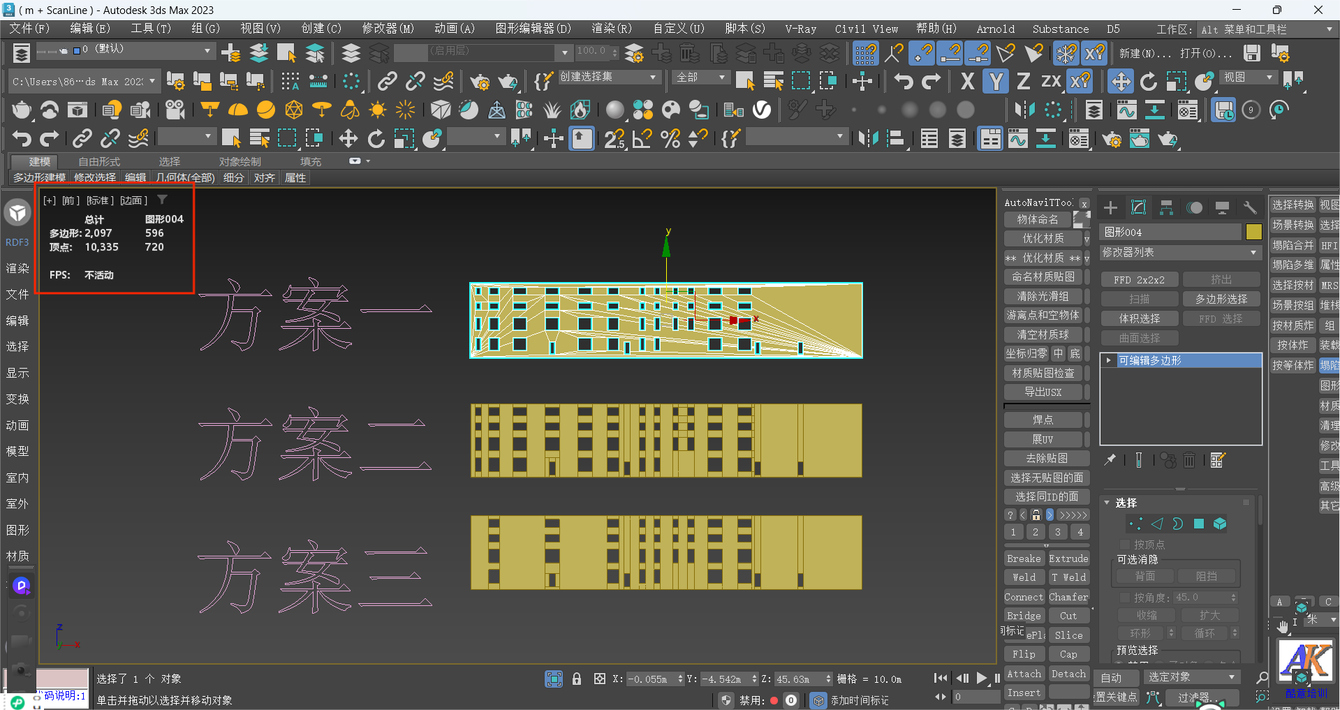 至此,方法一的窗洞模型抠洞操作完成。但此方法存在一定局限性,它仅支持 max2023 及以上的版本。虽然不会造成点线的丢失,但会导致模型的布线混乱,影响线框图的美观。在需要高精度、美观线框图展示的的项目中,可能不太适用。