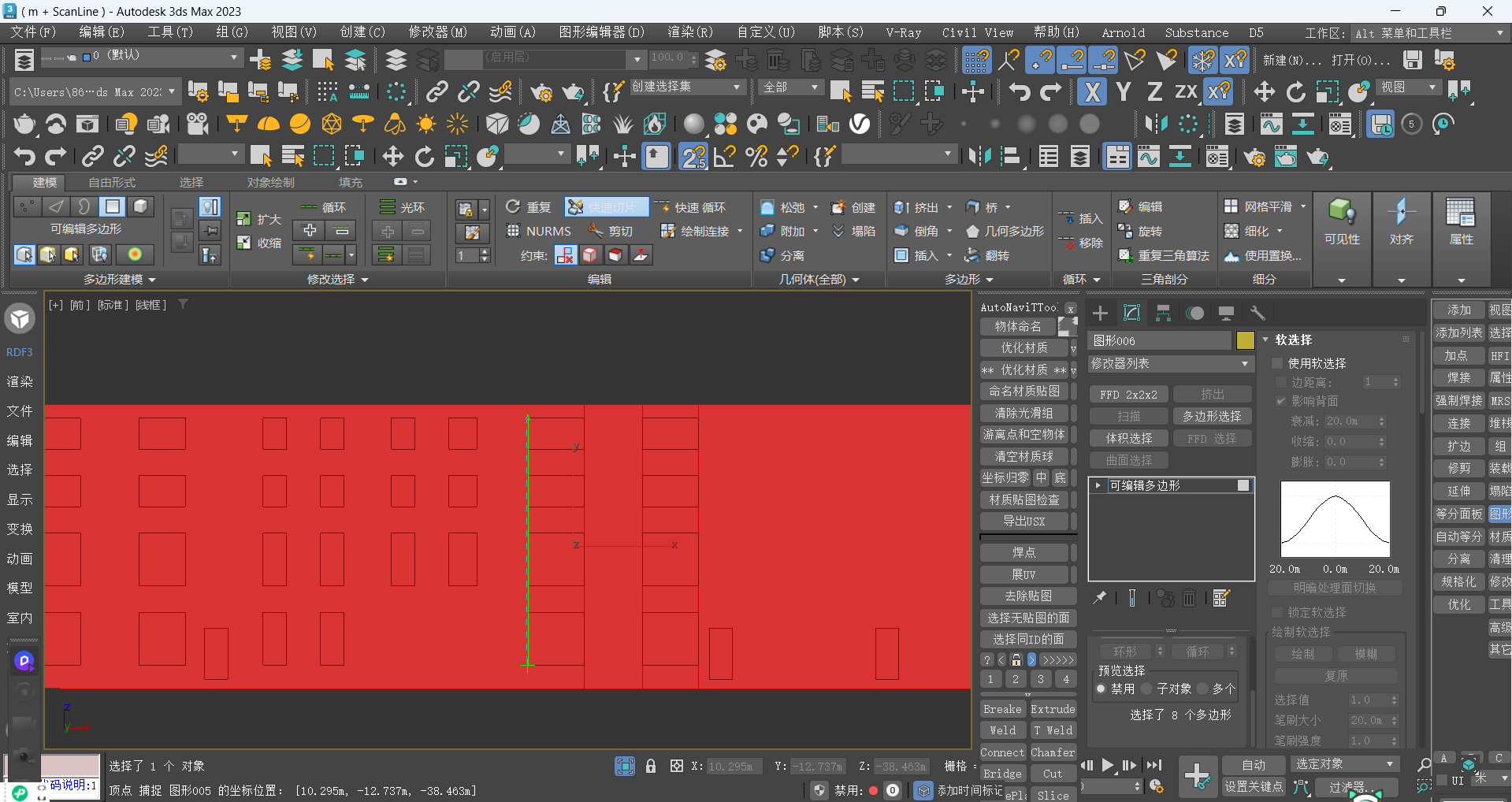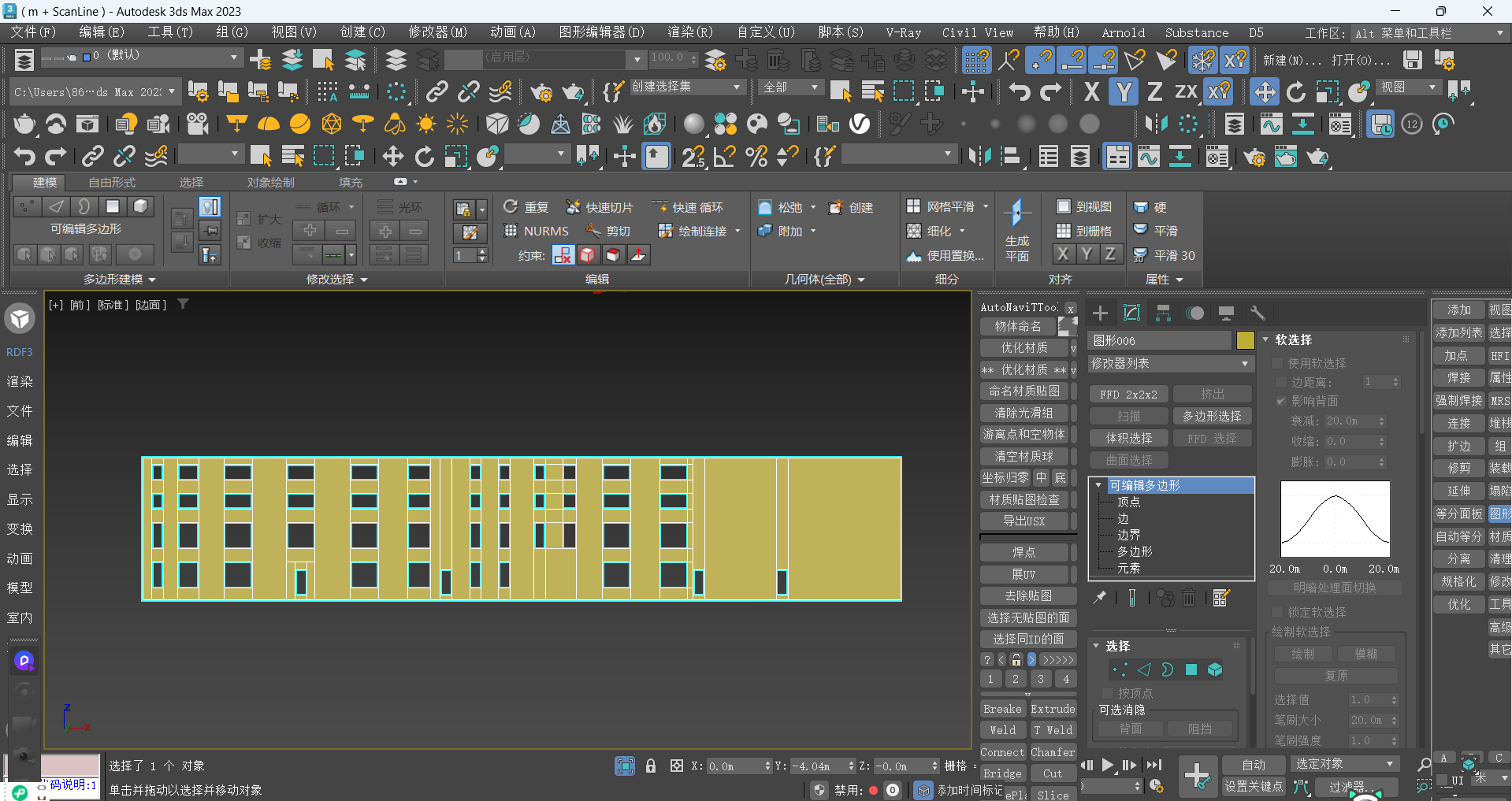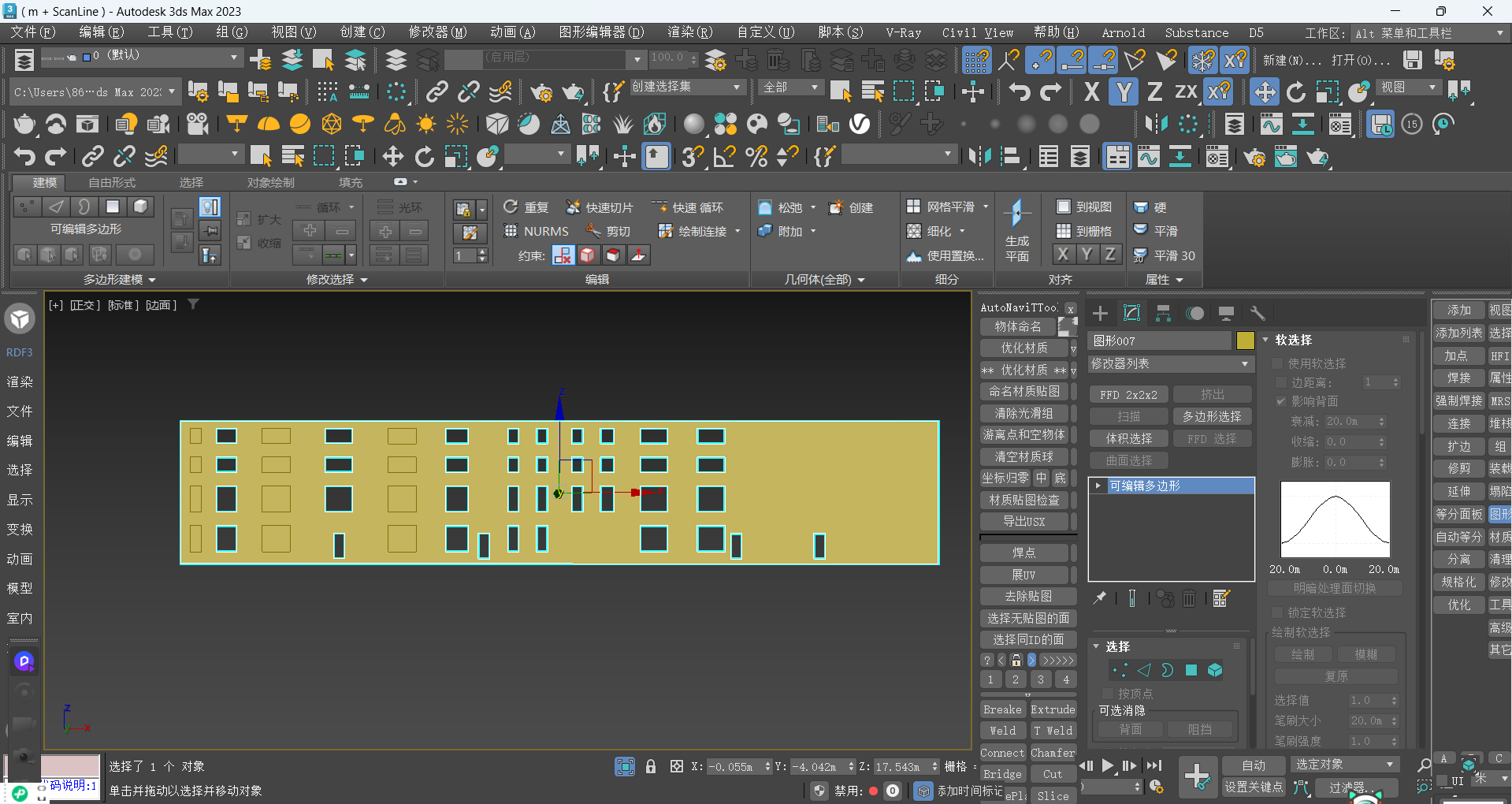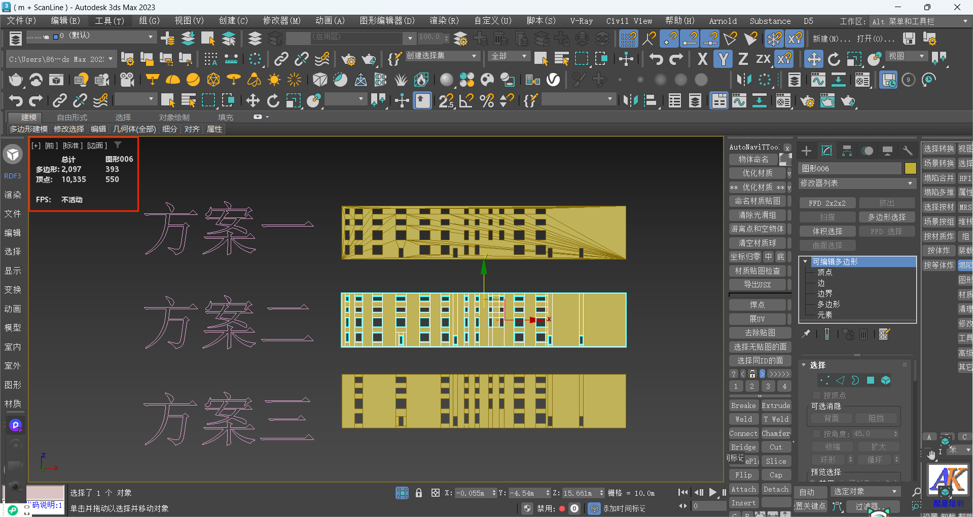 至此,方法一的窗洞模型抠洞操作完成。但此方法存在一定局限性,它仅支持 max2023 及以上的版本。虽然不会造成点线的丢失,但会导致模型的布线混乱,影响线框图的美观。在需要高精度、美观线框图展示的的项目中,可能不太适用。