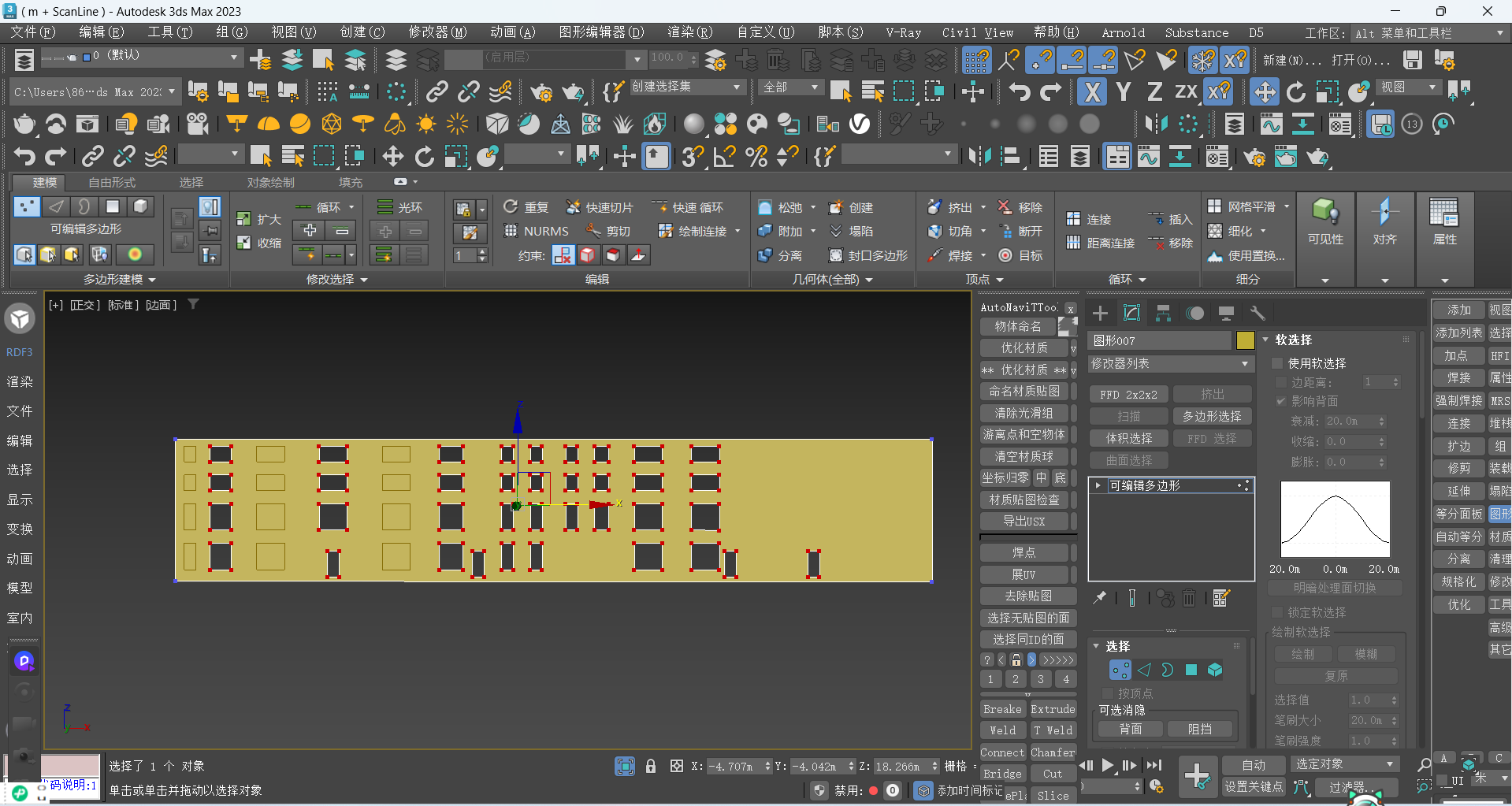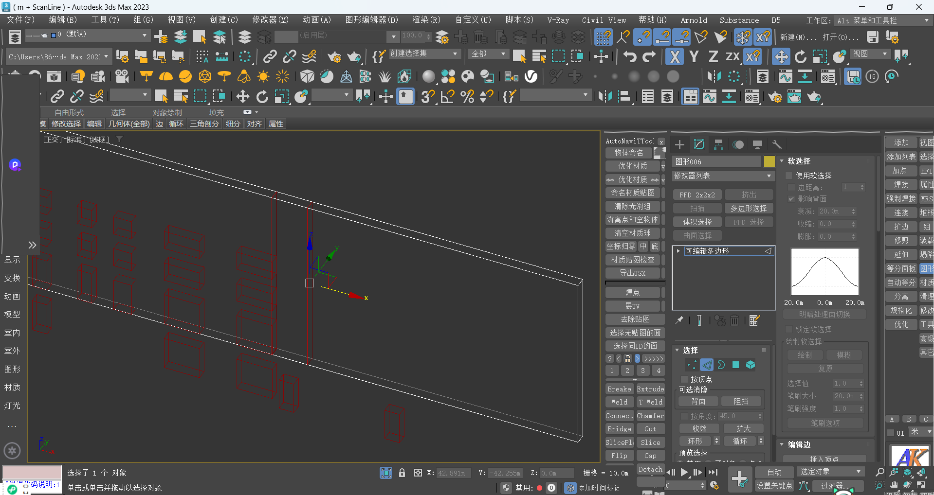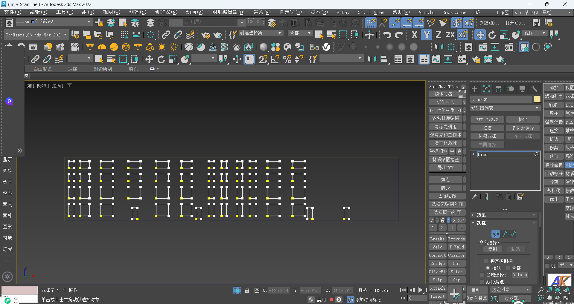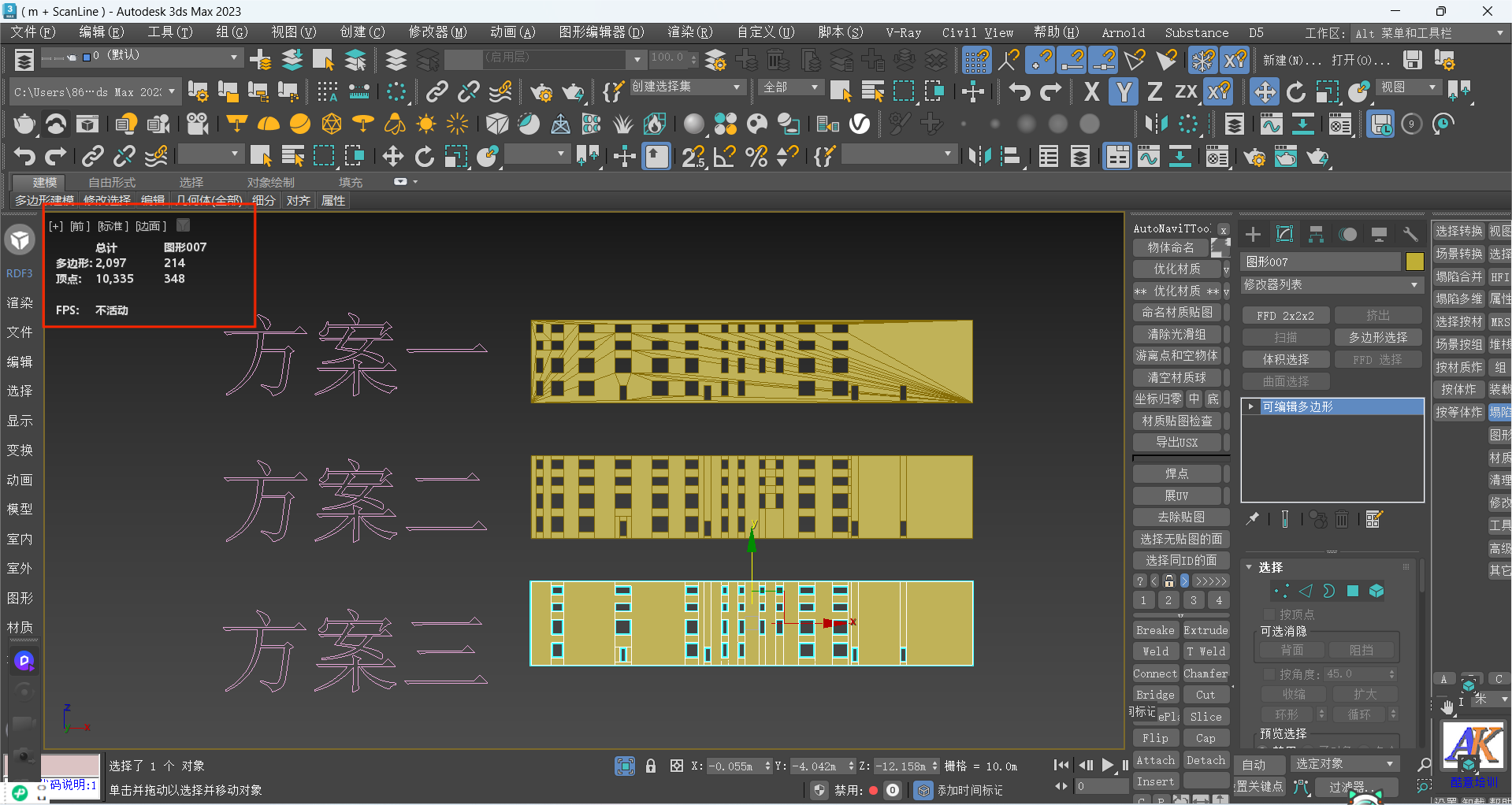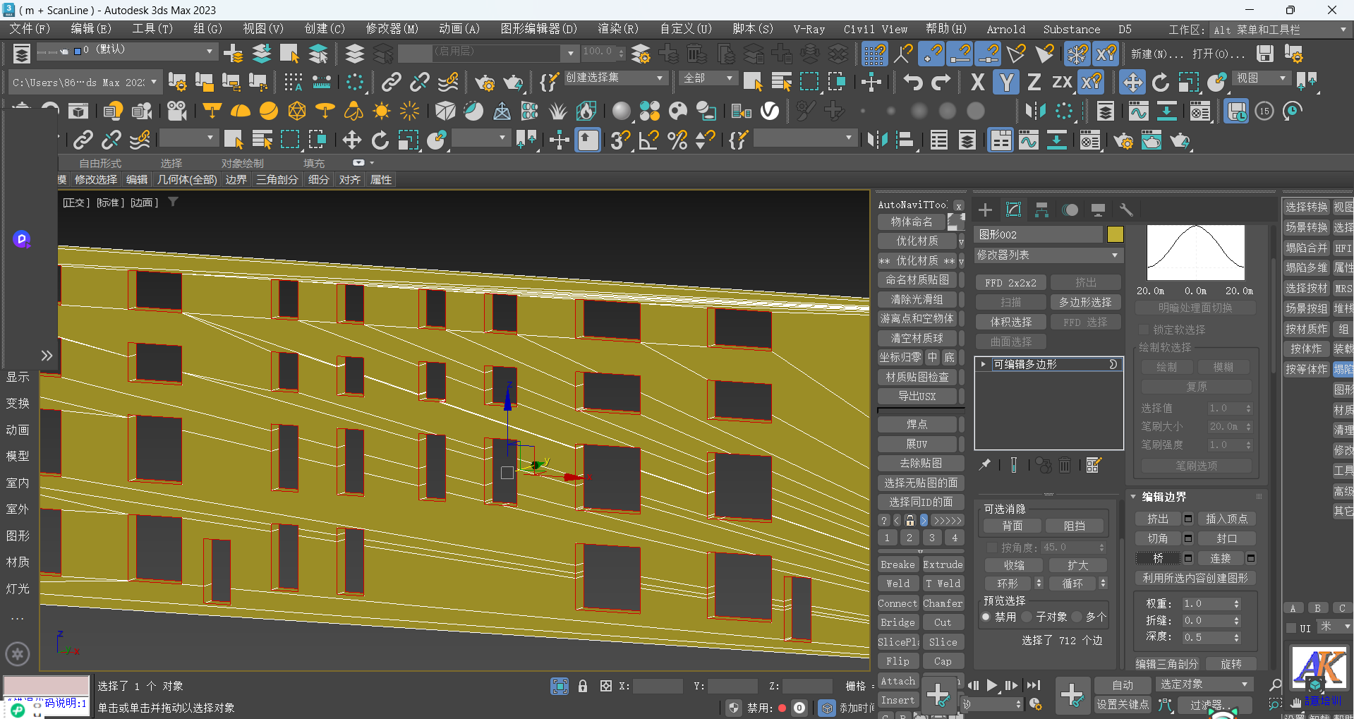 至此,方法一的窗洞模型抠洞操作完成。但此方法存在一定局限性,它仅支持 max2023 及以上的版本。虽然不会造成点线的丢失,但会导致模型的布线混乱,影响线框图的美观。在需要高精度、美观线框图展示的的项目中,可能不太适用。