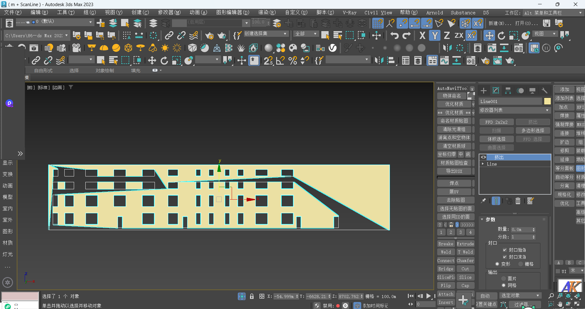 1、样条线挤出:与方法一相同,我们先把墙体外轮廓线分离出来,将中间的窗洞线与外轮廓线偏移一段距离,确保二者不重叠,然后给两个样条线都赋予挤出的命令。