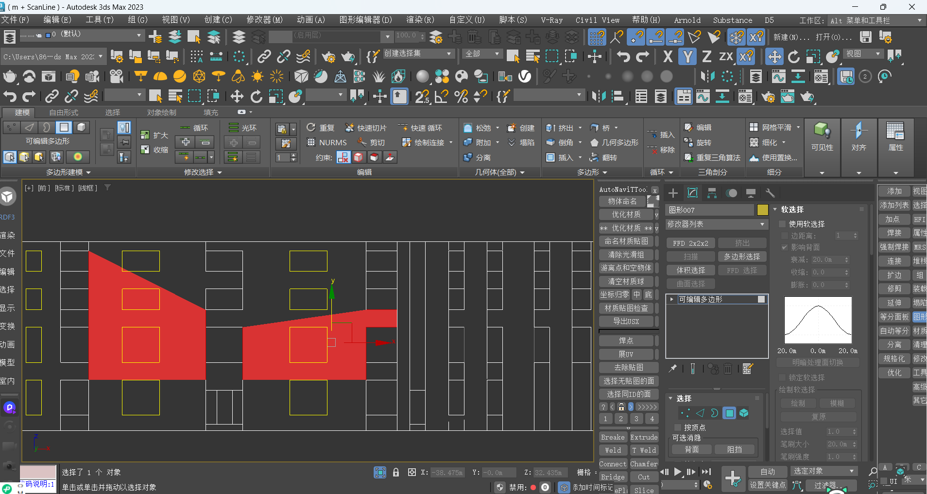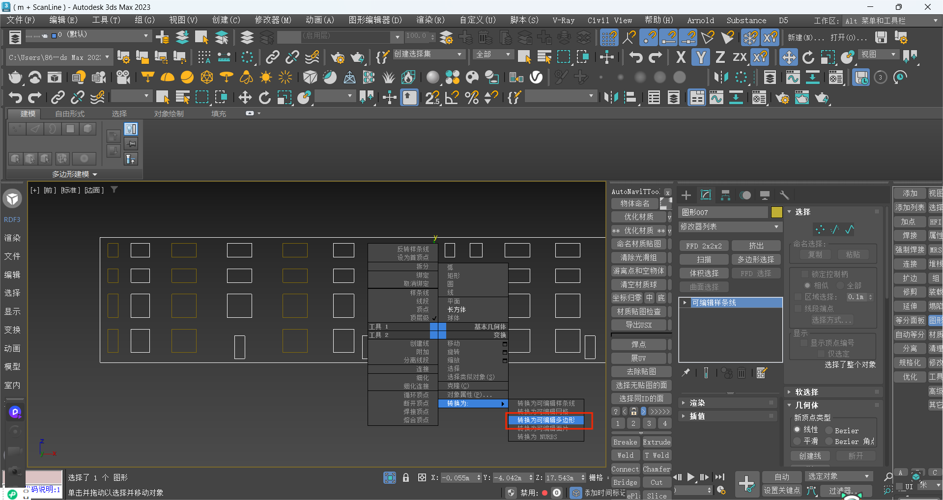 1、样条线转换:我们回到项目开始的第一步,当绘制好墙体样条线后,直接单击鼠标右键选择“转换为‘可编辑多变形’”。此时,样条线就转换为了可编辑多边形。