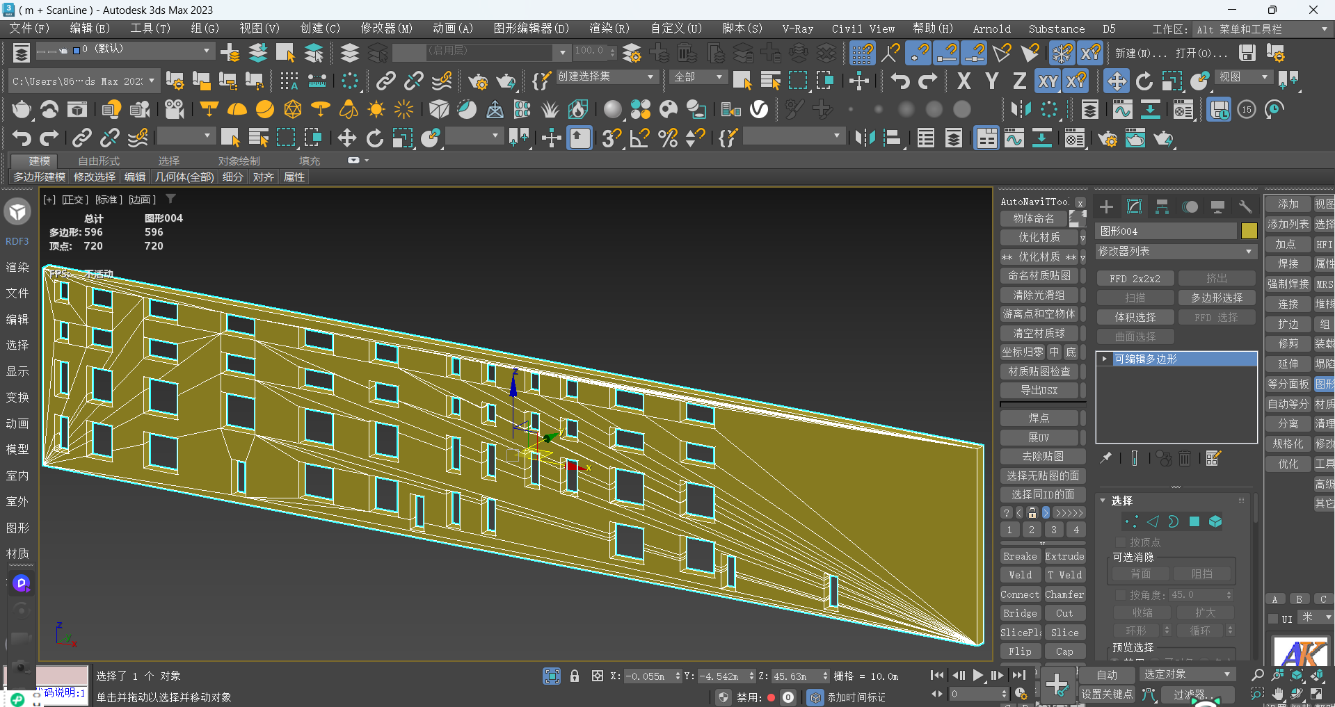 不管是我们选择以上的哪一种方法,当处理少数窗洞结构时,挤出样条线一般不会出现大问题。但一旦挤出多数窗洞结构,就会遭遇严重问题。如下图所示,整个墙体结构会被破坏,导致后续无法进行正常的模型编辑。