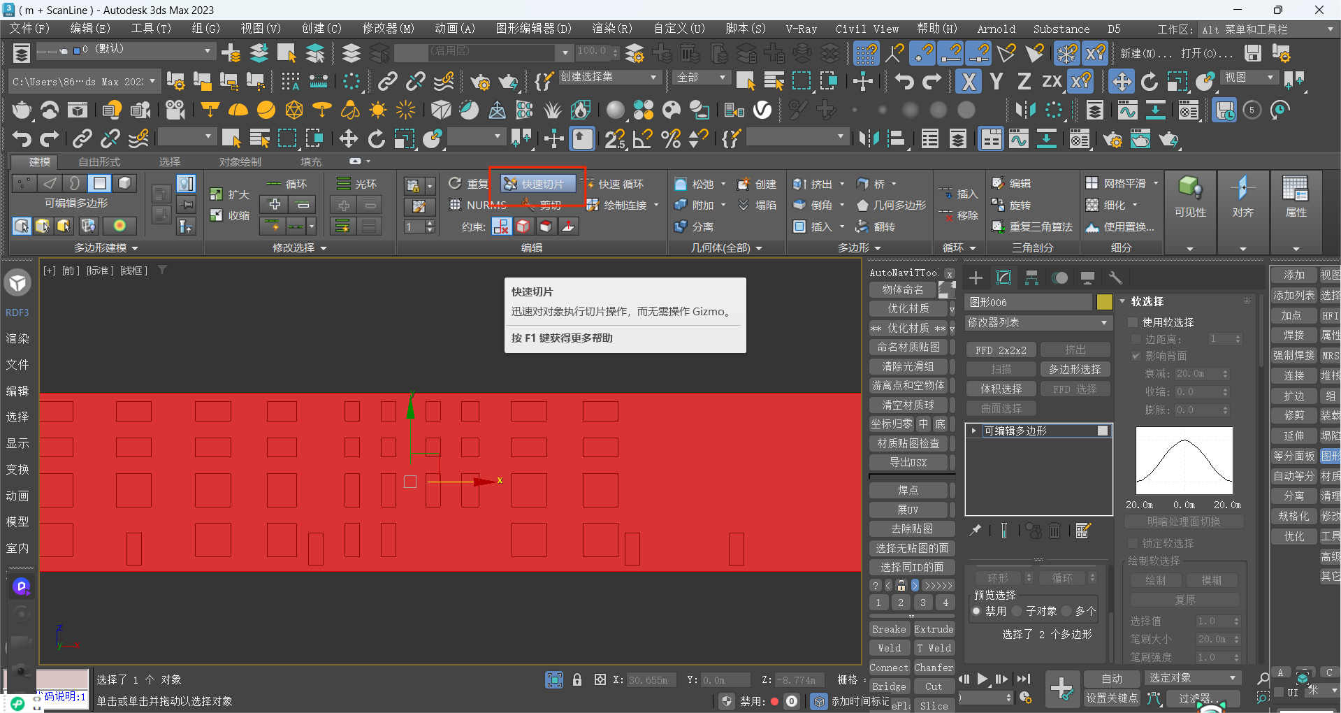 1、我们选择需要窗洞布线的两个面,以窗洞模型为参考,使用“快速切片”命令进行手动切线卡线。此方法可以利用三维捕捉精准捕捉到窗洞线,操作快捷且精准,是我们模型编辑中常用的方法。