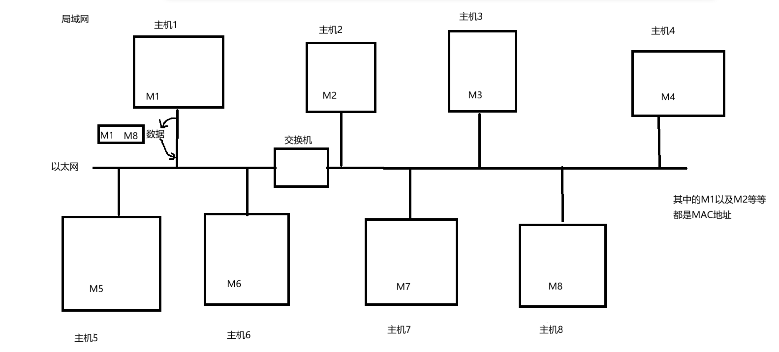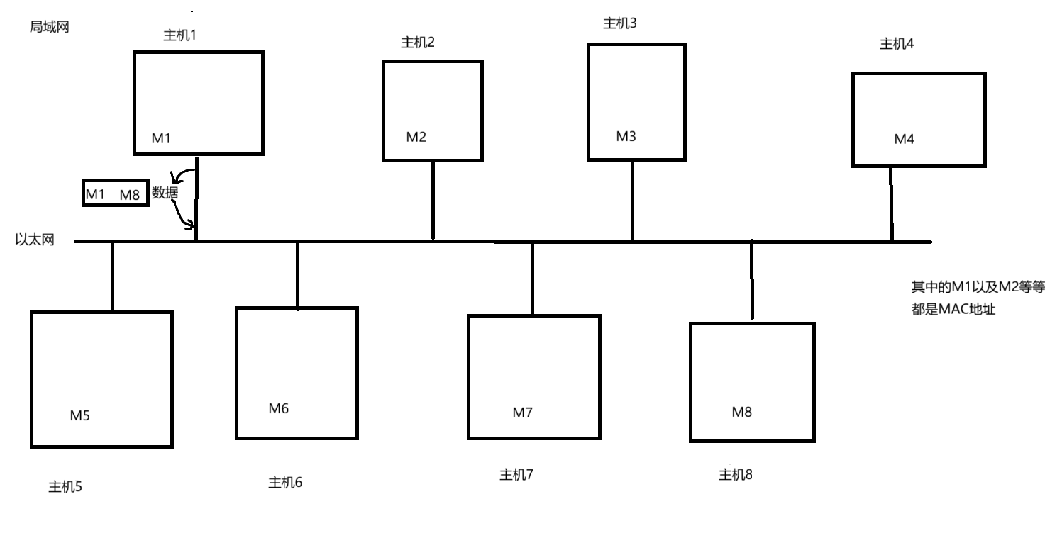 如上图所示,当主机1发送数据时,局域网中的所有的主机都能收到主机1发送的信息(物理层)。每台主机进行解析后(数据链路层),发现不是发给自己的数据时,就会将数据直接丢弃,如果发现是发给自己的数据,就会向上层递交。所以最终感觉上就是主机8收到了主机1发送的数据。