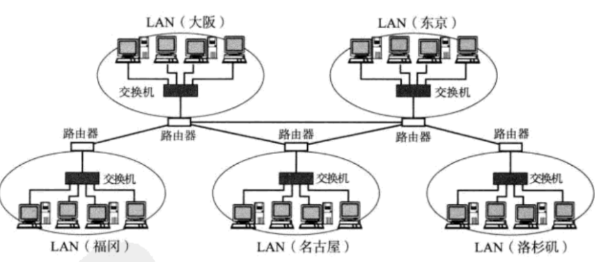 局域网:计算机数量更多了,通过交换机和路由器连接在一起。局域网是在较小地理范围内构建的网络,通常用于连接同一建筑或区域内的设备,比如家庭、办公室、学校机房等。一般通过线路连接或短距离无线连接。如下图所示:
