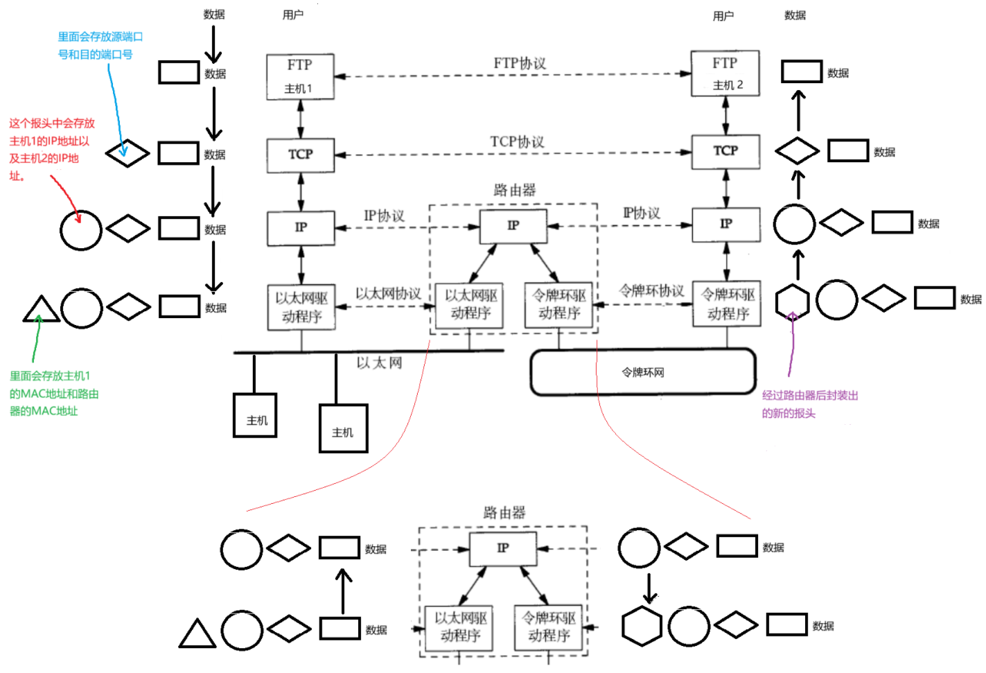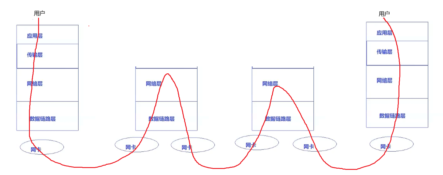 跨网络的主机进行信息传输,数据从一台计算机到另一台计算机传输过程中要经过一个或多个路由器。如下图所示: