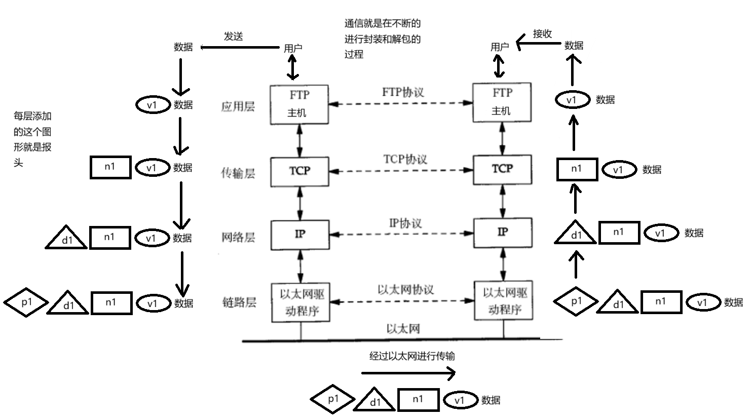 注:网络通信是要贯穿整个协议栈的,网络协议栈的层状结构中,每一层都是要有协议的。例如:以太网中的两台主机进行通信,如下图所示: