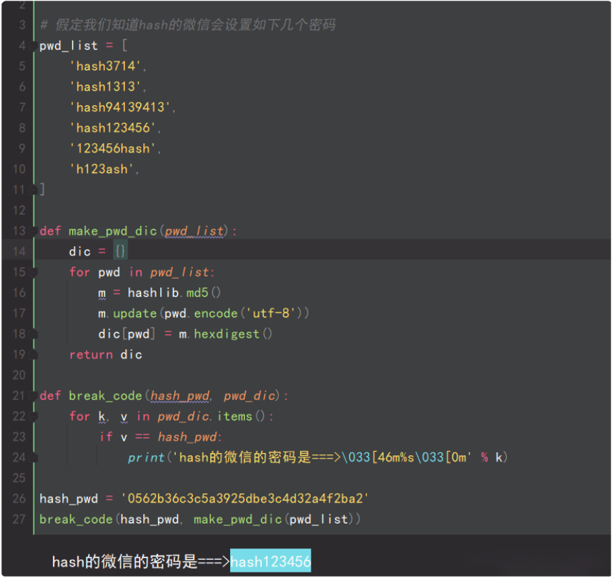 hash加密算法虽然看起来很厉害,但是他是存在一定缺陷的,即可以通过撞库可以反解,如下代码所示。