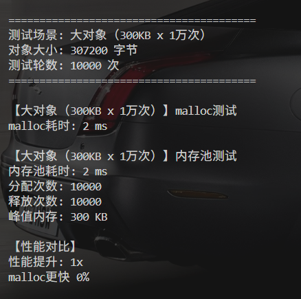 void ComparePerformance(size_t size, size_t rounds, const char* testName) {long long mallocTime = BenchmarkMalloc(size, rounds, testName);long long mempoolTime = BenchmarkMemoryPool(size, rounds, testName);// 计算性能提升倍数double speedup = (double)mallocTime / mempoolTime;if (speedup > 1.0) {cout << "内存池更快 " << (speedup - 1.0) * 100 << "%" << endl;} else {cout << "malloc更快 " << (1.0 / speedup - 1.0) * 100 << "%" << endl;}
