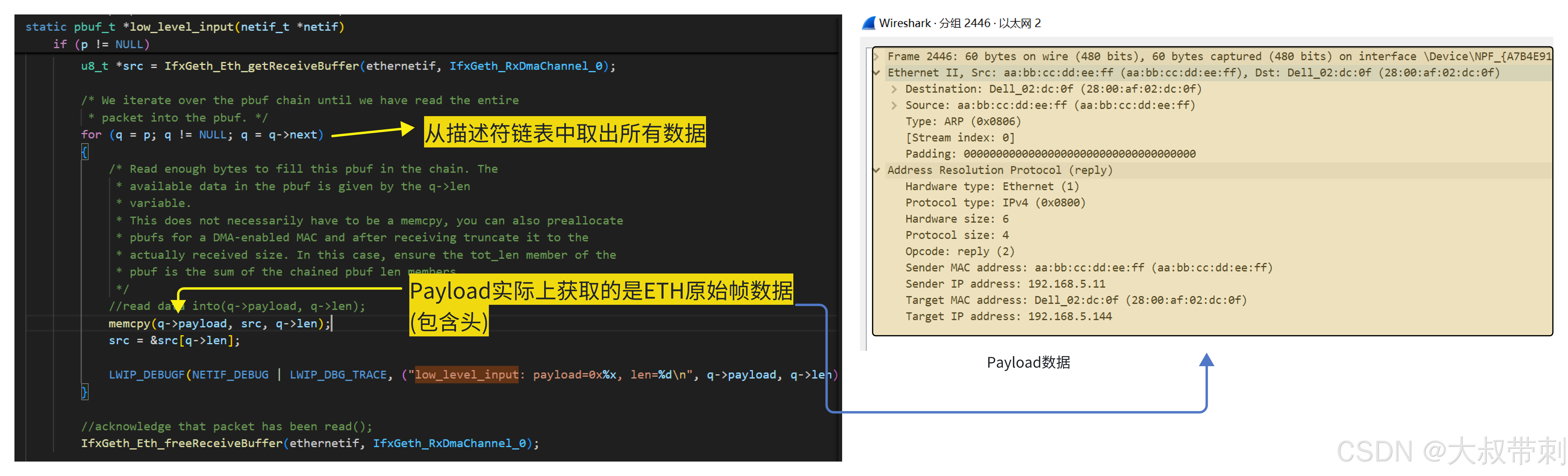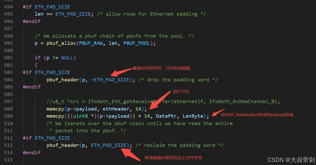 #endif//u8_t *src = IfxGeth_Eth_getReceiveBuffer(ethernetif, IfxGeth_RxDmaChannel_0);memcpy(p->payload, ethHeader, 14);//把头信息还原出来memcpy(((uint8 *)(p->payload)) + 14, DataPtr, LenByte);/* We iterate over the pbuf chain until we have read the entire* packet into the pbuf. */